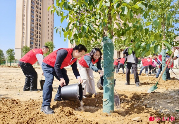 城东街道党员志愿者与学生携手共植新绿。