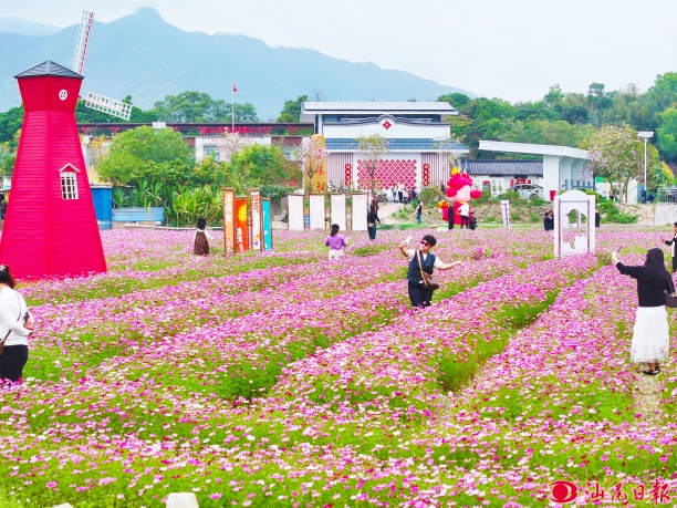 植绿添美的同时,“微改造”让闲置空间焕发新貌。走进东风村,昔日沉寂的冬闲田已变身绚烂花海。村前连片种植的格桑花迎春盛放,粉的、白的、紫的花朵交织成彩色地毯。精心布置的网红打卡点与田园风光相映成趣,吸引游客纷至沓来。“这里太美了,拍照特别出片!”几位游客在花海中流连忘返,不时举起手机定格美好瞬间。花海不仅为村庄聚拢人气、增添春意,更将“颜值”转化为“产值”,为后续带动农特产品销售、激活红色文旅发展蓄势赋能。