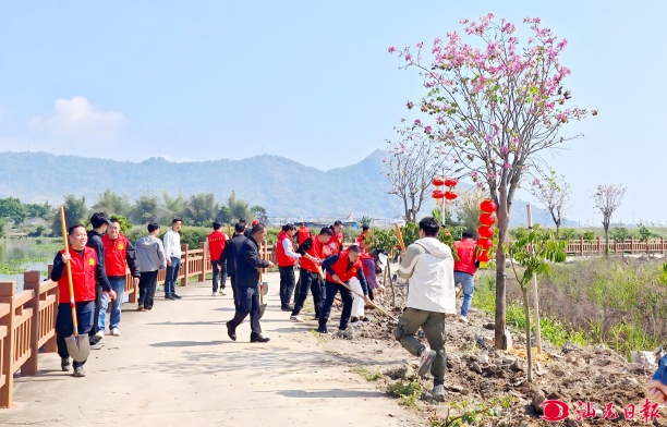 该镇领导干部与党员群众一起挥锹破土、扶苗定根。一株株杨梅、橄榄树苗被精心栽下,河岸旁新植的柳树也随风摇曳。经过大家的共同努力,近200株新苗在此“安家落户”,不仅为谢厝乡织就了生态绿带,更种下了“春华秋实”的丰收希望。