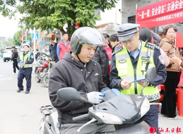 “大姐,您骑电动车接送孙子一定得把头盔戴牢,这可是出行的安全保障!”“大哥,这是交通承诺书,旁边可以免费领头盔,以后骑车记得规范佩戴哦!”近日,红海湾经济开发区田墘街道办事处联合市公安局交管支队红海湾大队、该区自然资源和建设局、中铁(广州)投控有限公司等单位,启动“一盔一戴,安全常在”交通安全集中宣传活动,通过“宣讲+整治+赠盔”形式,将安全知识送到群众身边。