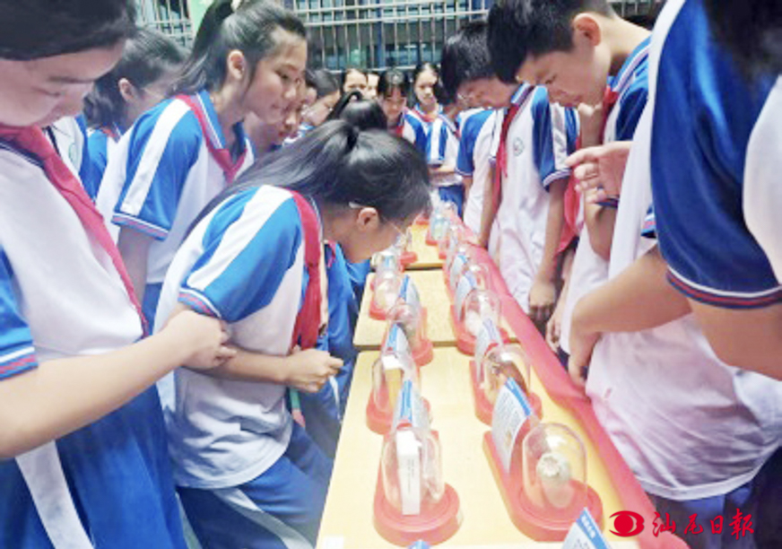图为学生们参观仿真毒品模型。