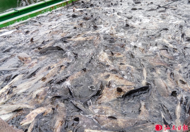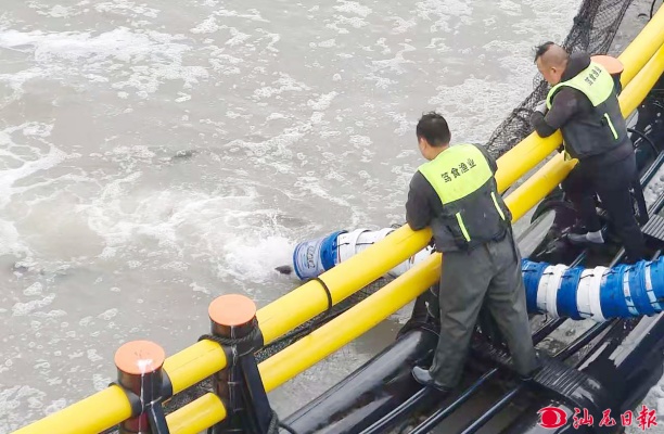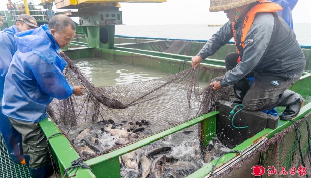 工作人员对渔船上的鱼苗拉网送入投放管道。 汕尾日报记者 许楚璇 摄