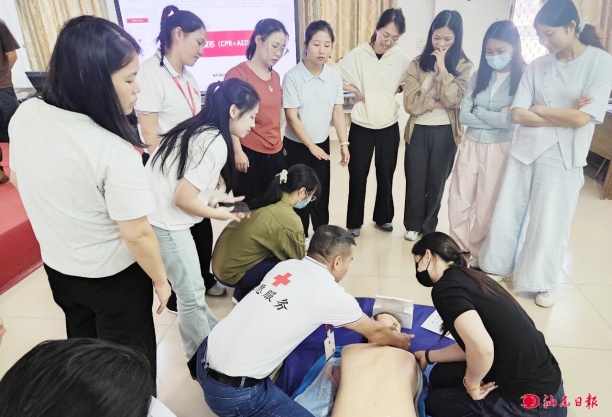 培训活动分为上下两个半场,内容充实,理论与实践紧密结合。上半场由海丰县红十字会的资深讲师担任主讲。她凭借其丰富的专业知识和教学经验,为参训教师们系统讲解了心肺复苏(CPR)与自动体外除颤器(AED)使用的完整流程、操作要点及注意事项,并详细阐述了气道异物梗阻的识别与现场急救方法(如海姆立克急救法)。讲解过程深入浅出,图文并茂,重点突出,使参训教师对应急救护的核心知识有了清晰、准确的认识。