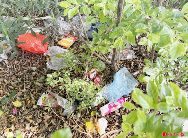 记者看到,公园入口处植被茂盛,生态环境总体良好。但深入内部后,问题逐一显现:绿化带中散落着零食袋、矿泉水瓶、果皮等生活垃圾,部分角落堆积严重;入口广告牌漆面斑驳、破损不堪;园内标识牌东倒西歪,方向指示牌内容缺失,给游客带来不便;木栈道地板和休闲座椅也存在不同程度的破损。