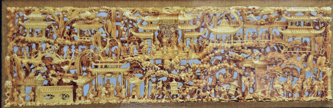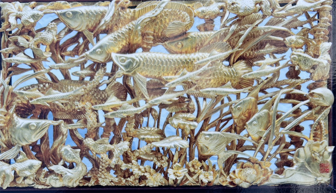 金木通雕是一项民间传统工艺,就是在一块由银杏、冬青或樟树等木材的固定面积上,采用浮雕、圆雕、透雕、立雕、通雕等和线刻等手法,雕成作品,然后在表面贴上金箔,形成金碧辉煌,光彩夺目的效果。其中,将木头从内到外全部凿穿挖透加以雕刻的“通雕”,正是陈万景的家传绝学,作品在上世纪六十年代前曾大量出口欧美、日本和南洋地区。
