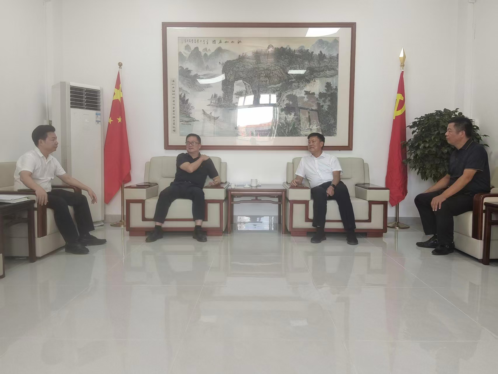 在卧龙村调研结束后,陈炳玄一行到达河西街道办事处,与汕尾市直单位定点包干河西街道牵头单位、汕尾市工信局副局长冯其松和河西街道办事处党工委书记蔡景章,共同交流“百千万工程”三年初见成效相关工作。