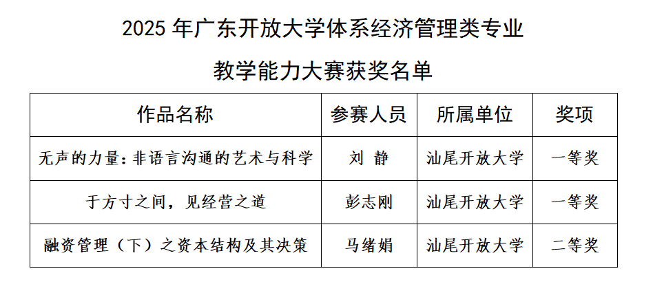 2025年11月24日,广东开放大学公布了2025年度体系内经济管理类专业教学能力大赛评选结果,我校三项参赛作品表现突出,喜获荣誉。刘静老师的《无声的力量:非语言沟通的艺术与科学》与彭志刚老师的《于方寸之间,见经营之道》双双荣获一等奖;马绪娟老师的《融资管理(下)之资本结构及其决策》获得二等奖。