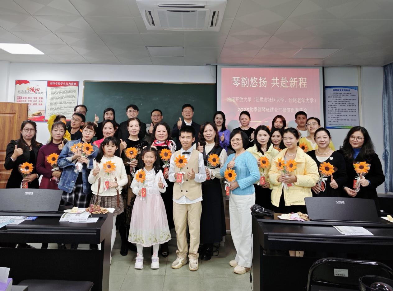 整场音乐会不仅是技艺的展示,更是汕尾开放大学致力于构建服务全民终身学习的学习型汕尾的生动实践。钢琴班的学员涵盖了小学生、青年学员、中年学员、老年学员,学员们用指尖的旋律证明:学习无关年龄,只关热爱。他们在钢琴前专注的身影,是对“热爱可抵岁月漫长”的生动诠释。