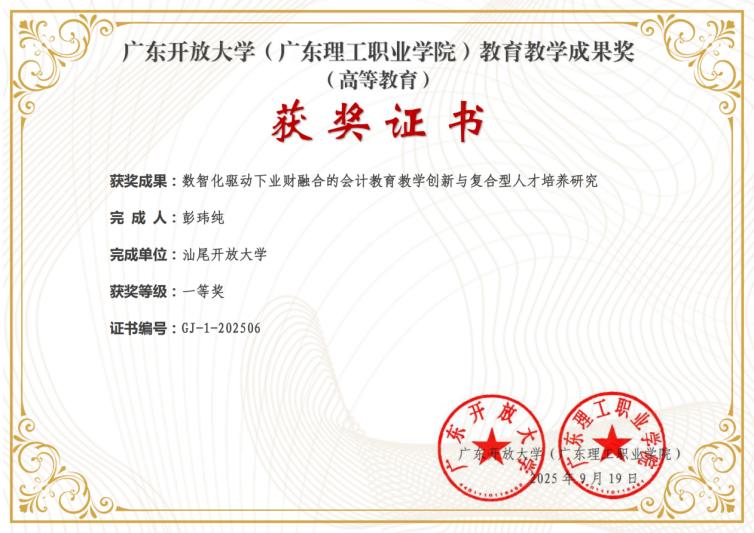 汕尾开放大学彭玮纯老师的《数智化驱动下业财融合的会计教育教学创新与复合型人才培养研究》荣获一等奖,研究立足教育数字化转型与产业变革双重逻辑,聚焦课程体系重构、教学方法革新、师资能力提升三大维度,以“业财融合”为核心,构建了四位一体的创新路径,创建多维融合的会计教育新范式,提出了数智化背景下会计教育改革的系统性解决方案,推动会计教育范式革新,研究为培养适应数字经济时代需求的复合型人才提供理论支撑与实践范式。彭玮纯老师所带班级的学生陈成丰同学获得国家开放大学优秀毕业生、高开成同学荣获国家开放大学优秀学生干部。彭玮纯老师所带班级学生陈小雅、薛培钦、陈雪娇等同学在“汕尾开放大学体系庆祝建党100周年学生主题教育系列活动”中荣获优秀奖项,彭玮纯老师在汕尾开放大学体系 “庆祝中国共产党成立100周年学生主题教育系列活动”被评为“优秀组织班主任”,展现了汕尾开放大学师生爱国、爱党的真挚情怀,增强开放大学办学体系的凝聚力,激发了广大学生的民族自豪感和历史责任感,学生在德智美劳多方面不断发展,培育了一批批适应社会经济发展需求的复合型人才。