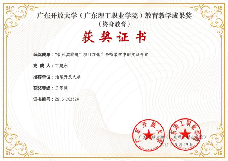 丁建永老师的《 “音乐类非遗 ”项目在老年合唱教学中的实践探索》荣获三等奖,研究立足汕尾地区丰富的音乐类非物质文化遗产资源,探索其在老年教育中的创新融合路径,聚焦汕尾渔歌、白字戏、西秦戏等国家级非遗项目,通过调研、实践、改革三大层面,系统梳理了非遗音乐在老年合唱教学中的现状与价值,提出了一套具有地方特色的教学推广方案。