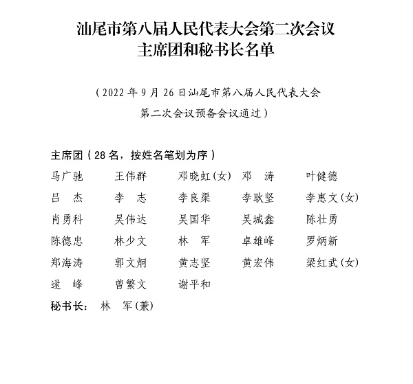 汕尾市第八届人民代表大会第二次会议主席团和秘书长名单