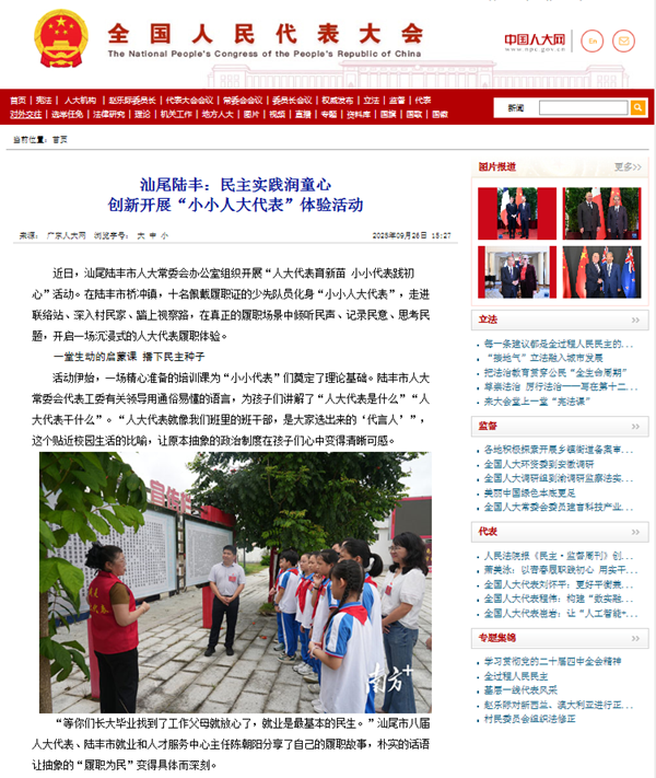 《中国人大网》2025年9月26日转发了《汕尾陆丰:民主实践润童心 创新开展“小小人大代表”体验活动》,现转发。